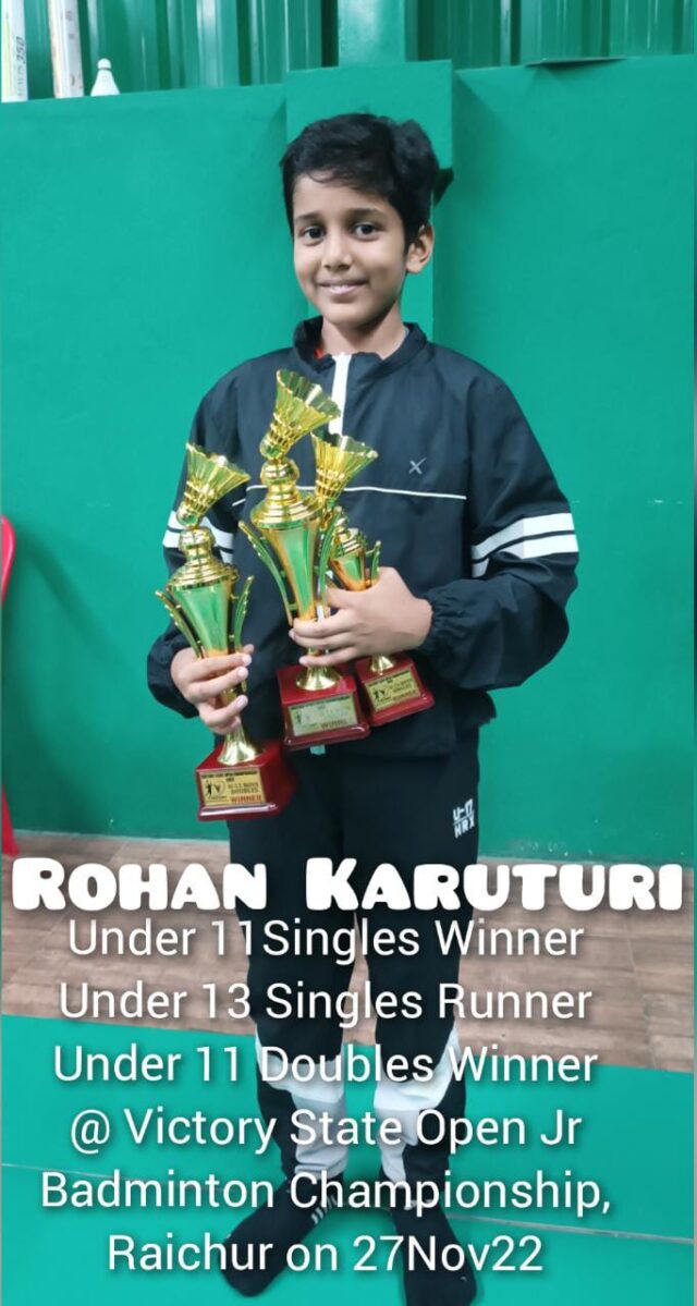 Rohan Karuturi Grade 4 of NCS won the following Under 11 Singles Winner Under 11 Doubles Winner Under 13 Singles Runner In Victory State Open Jr Badminton Championship @ Victory Badminton Academy, Raichur On 27th November 2022 He got 3 Trophies, Certificates, Rs 4,000/- Prize Money
