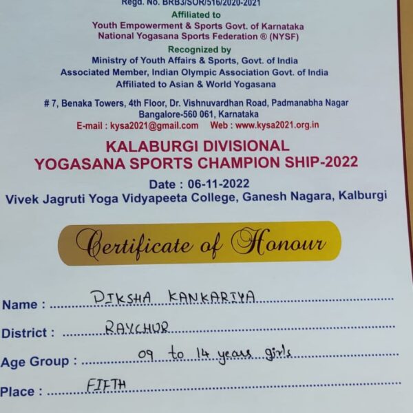 Diksha Kankariya of NCS grade 9 secured 5th place at Divisional level Yogasana Sports Championship – 2022 held on 06th Nov, 2022,